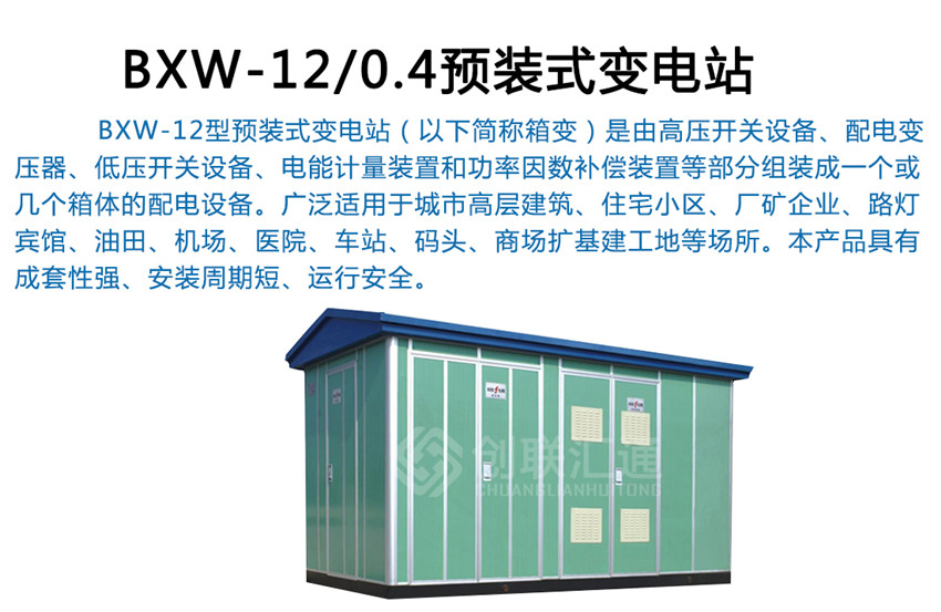 BXW-12型預(yù)裝式變電站(以下簡稱箱變)是由高壓開關(guān)設(shè)備、配電變壓器、低壓開關(guān)設(shè)備、電能計量裝置和功率因數(shù)補(bǔ)償裝置等部分組裝成一個或幾個箱體的配電設(shè)備。廣泛適用于城市高層建筑、住宅小區(qū)、廠礦企業(yè)、路燈、賓館、油田、機(jī)場、醫(yī)院、車站、碼頭、商場擴(kuò)基建工地等場所。本產(chǎn)品具有成套性強(qiáng)、安裝周期短、運(yùn)行安全